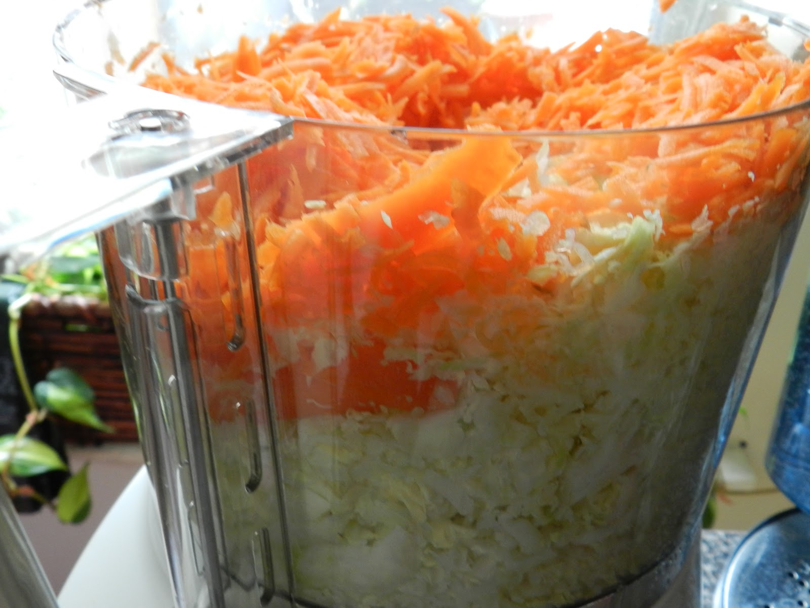 Grate zucchini on large side of box grater or put in food processor and shred. I would normally use the food processor, but the idea of lugging it out and then washing everything seemed more of a hassle than it was worth for 5 minutes of grating.